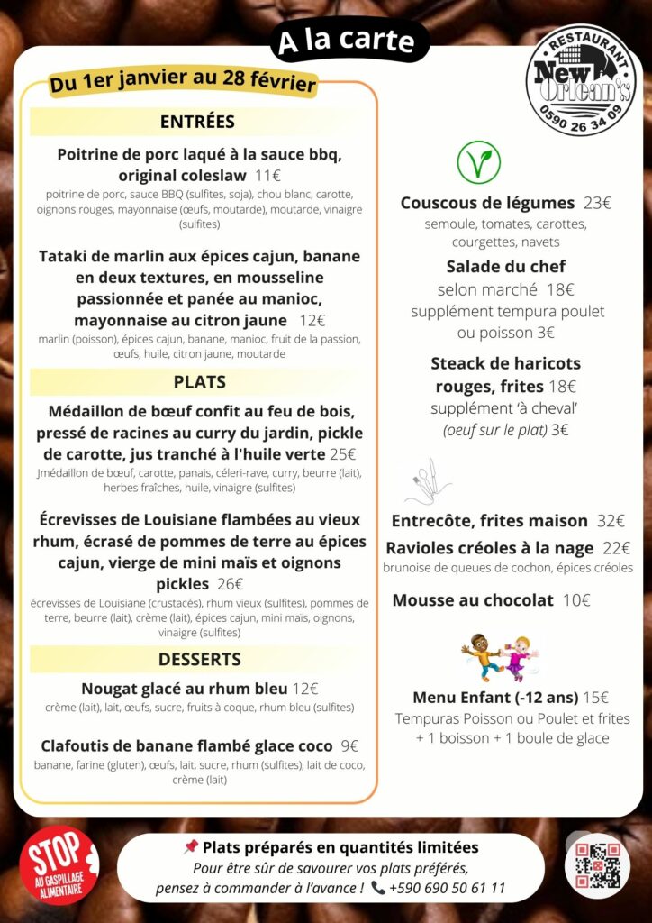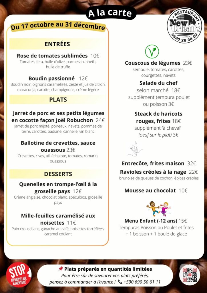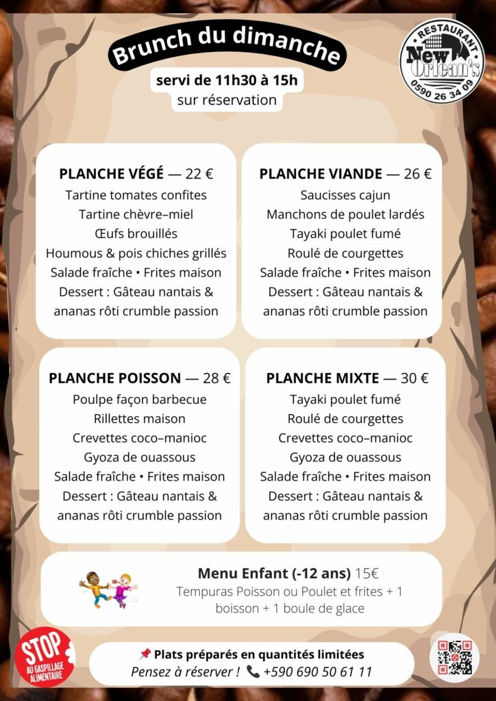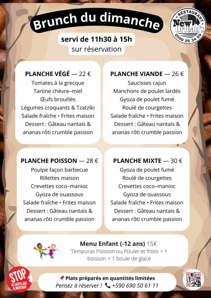 Réservés au dimanche midi, nos menus célèbrent la gourmandise en toute convivialité : accras en ouverture, plats généreux aux saveurs épicées ou flambées, et un doux final glacé pour conclure en beauté.