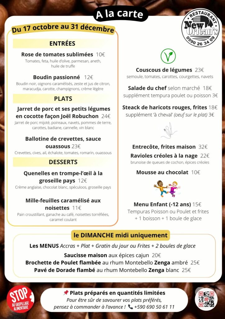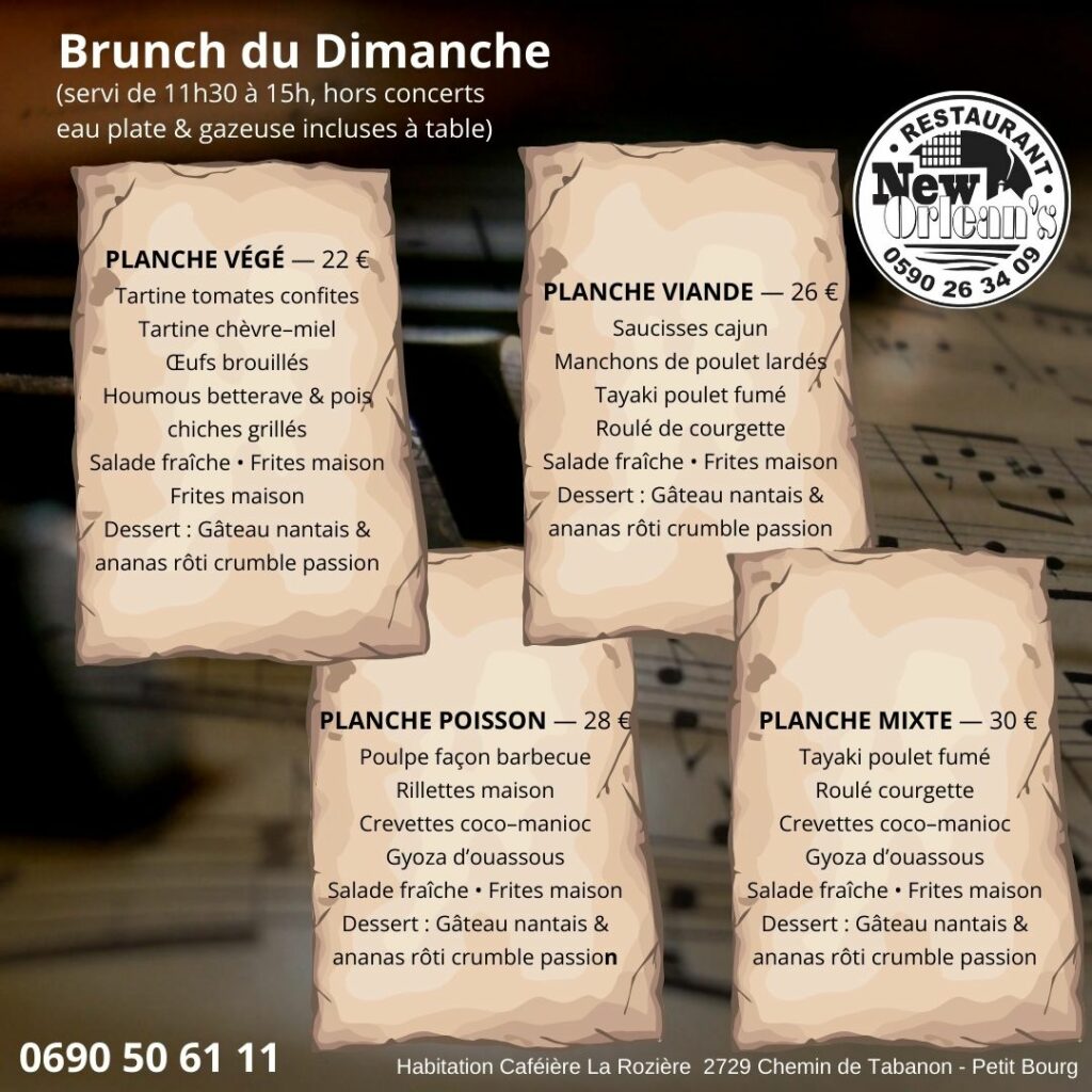 Réservés au dimanche midi, nos menus célèbrent la gourmandise en toute convivialité : accras en ouverture, plats généreux aux saveurs épicées ou flambées, et un doux final glacé pour conclure en beauté.